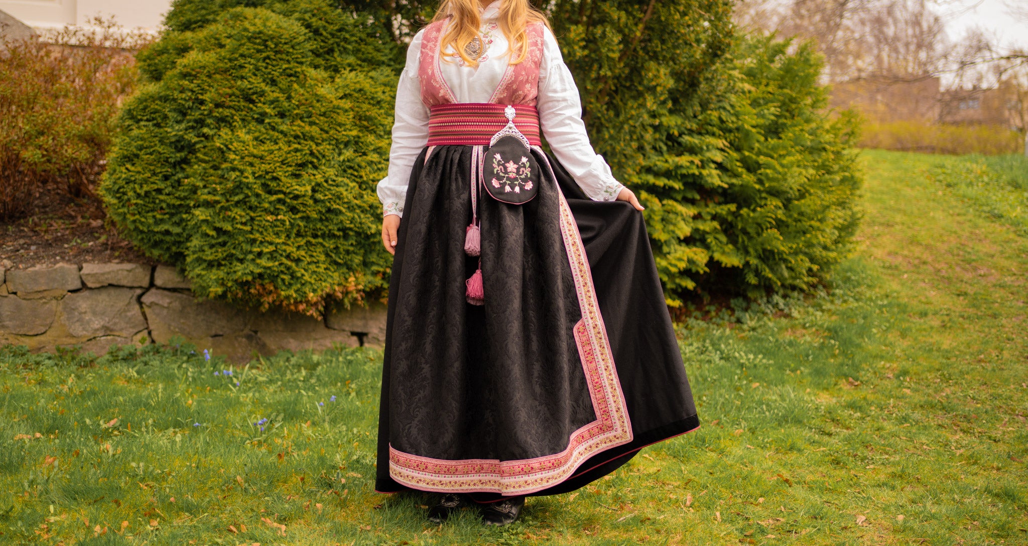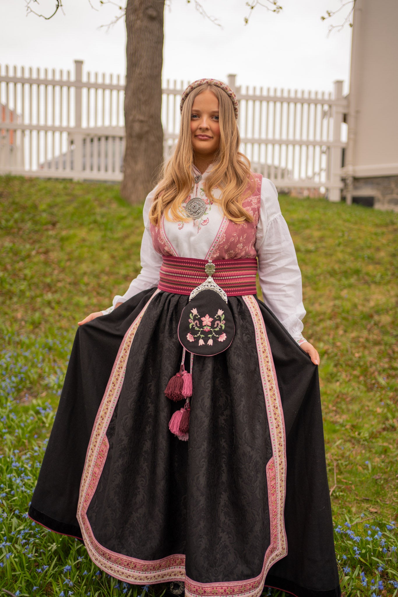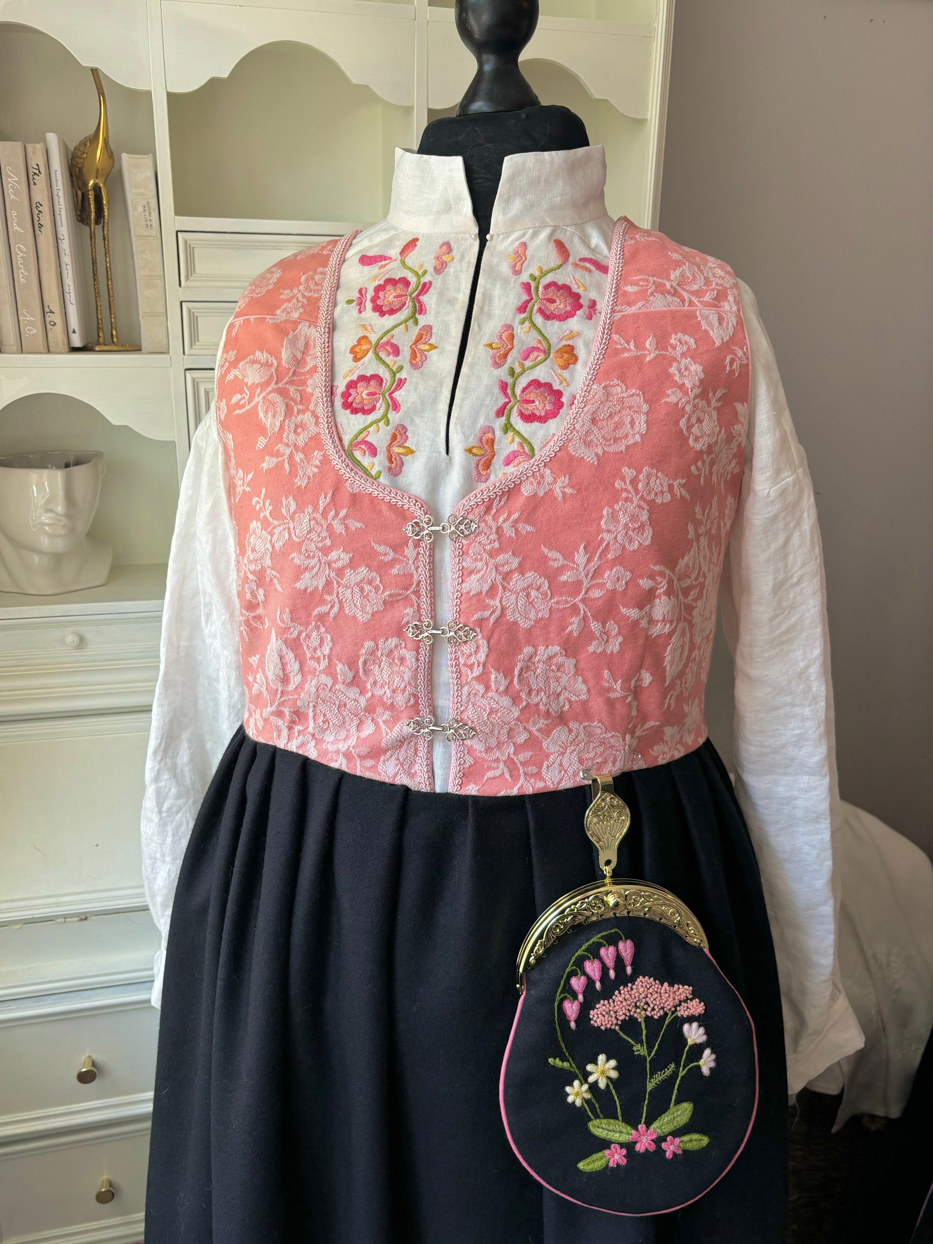 Denne nydelige beltestakken ble spesiallaget til konfirmasjon. Den er i vakre gammel-rosa farger og alle broderiene er unikt designet etter ønske og tegnet for hånd.