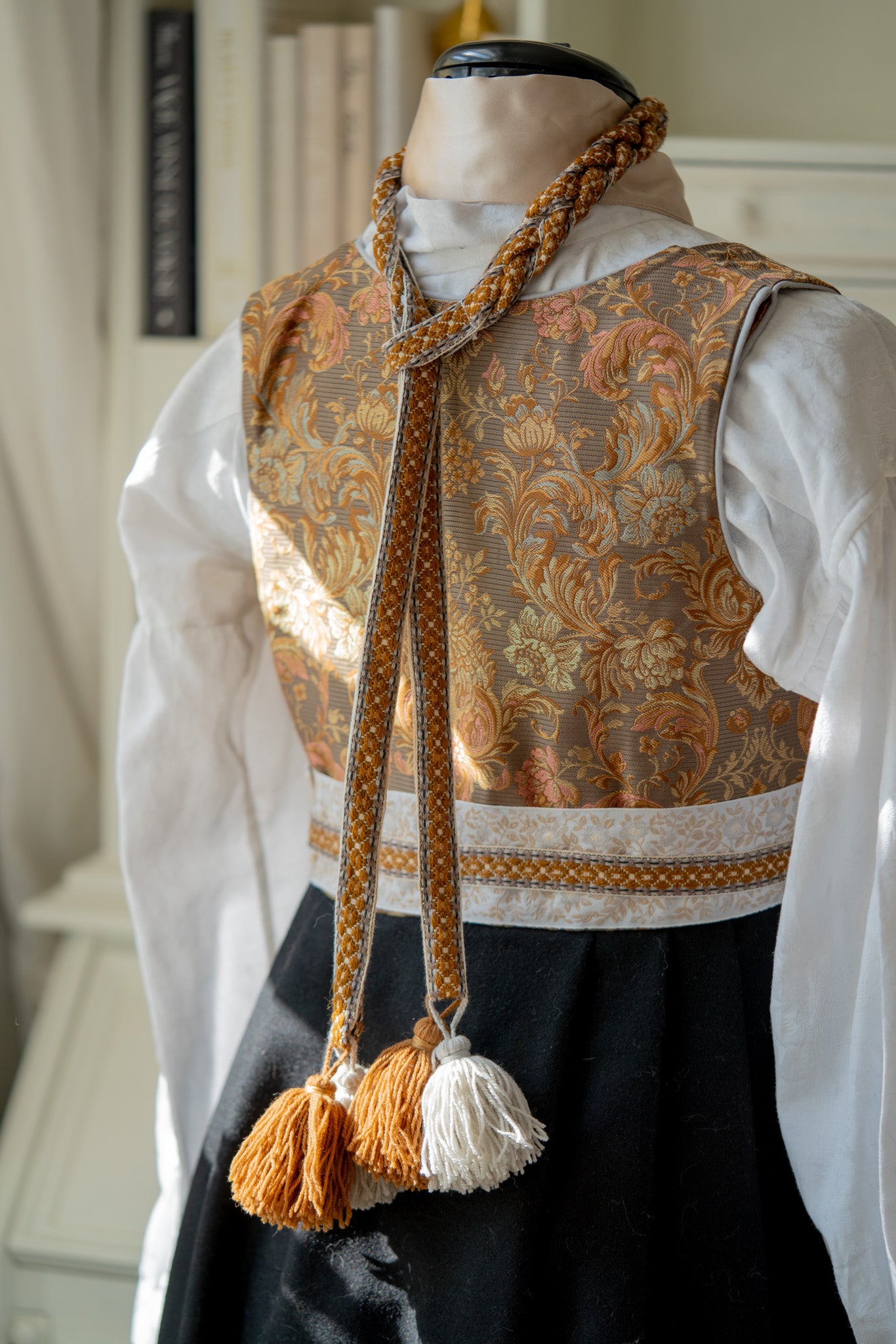 Denne gyldne fantasistakken er nettopp ferdigstilt og klar til salg. Denne er helt unik og laget for å passe hvem som helst. Den er sydd sammen i størrelse S men kan legges både inn og ut til strl. XS-L etter ønske.