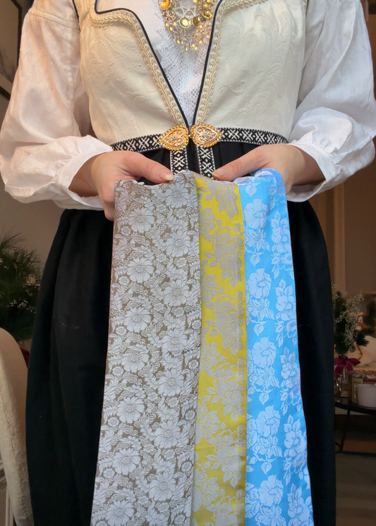 Stoffene spesialbestiller vi etter hva du ønsker og du/dere vil få god veiledning til sammensetning av tekstiler. Drakten blir sydd i Trondheim etter gamle bunadstradisjoner og jeg hjelper deg med å velge hvilken fasong du ønsker og designe hvordan drakten skal se ut for at den skal være helt perfekt og unik for deg.