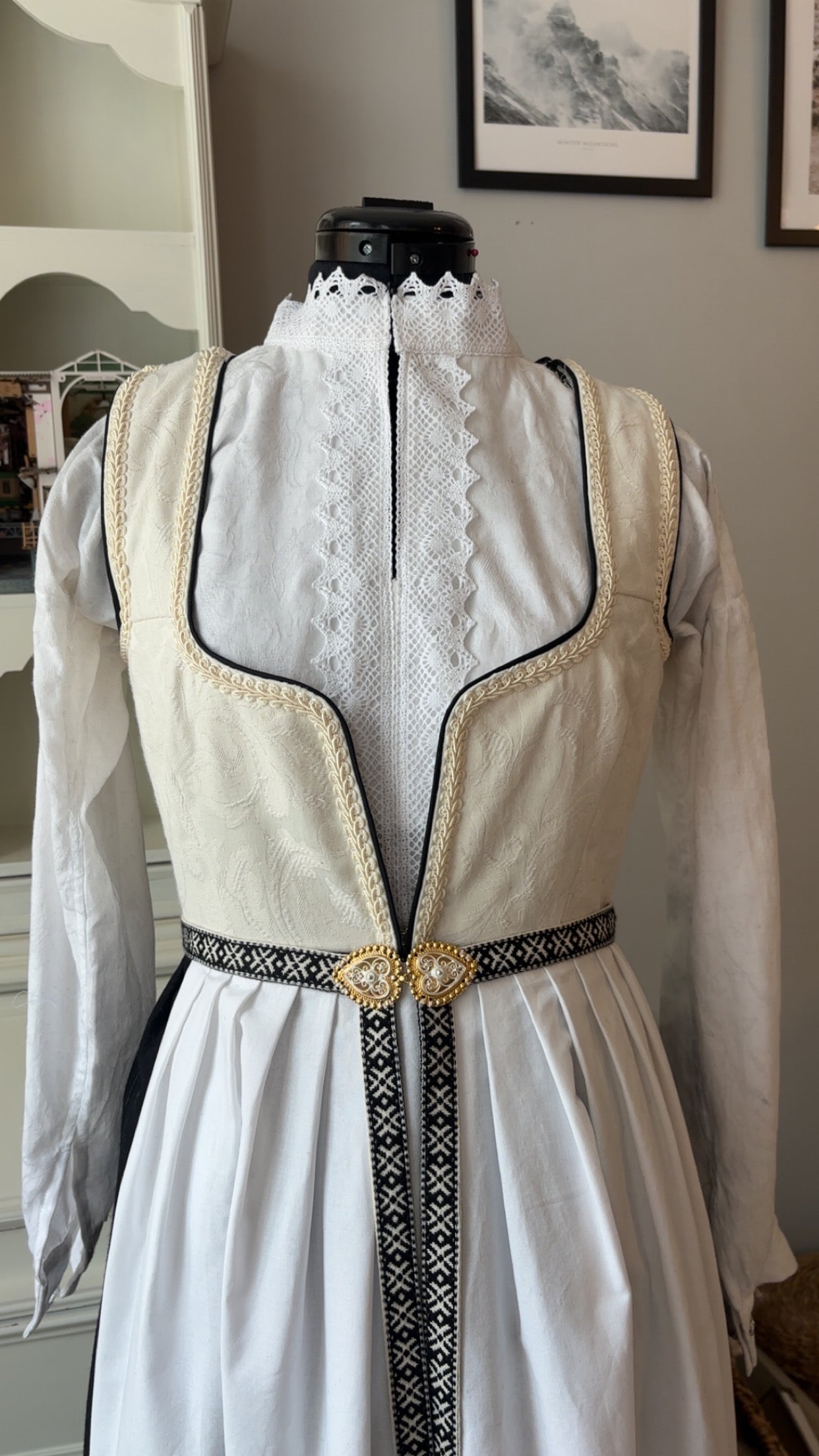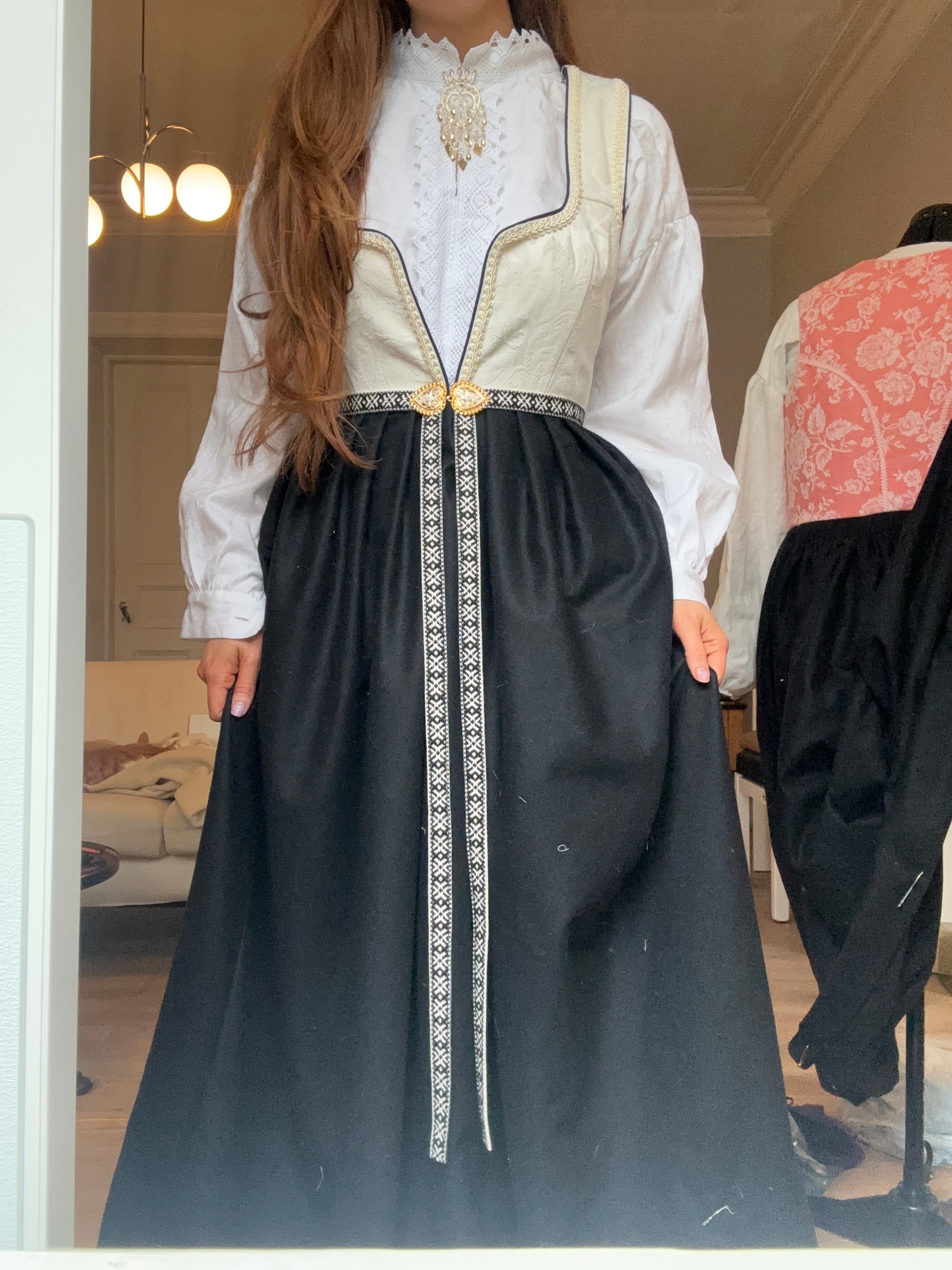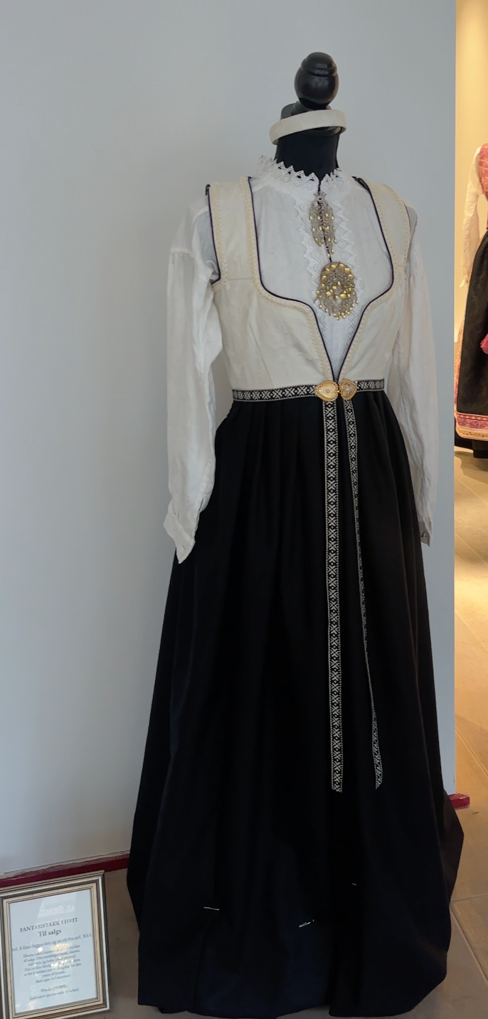 Denne vakre Fantasistakken i hvite farger er ferdig og klar til salgs. Den er satt sammen i størrelse XS/S (small) men kan legges inn/ut til en XXS-XL, den legges inn/ut gratis ved bestilling. Den kan også legges opp/ned til alle lengder og dette gjøres også uten ekstra kostnad. Den medfølger en nydelig bomullsskjorte med blonder, forkle, forklebånd med sølje/spenne (produsent: Vossasylv) og hårbøyle i samme stoff som vesten. Alt er designet, sydd og satt sammen i Trondheim.